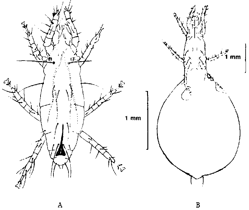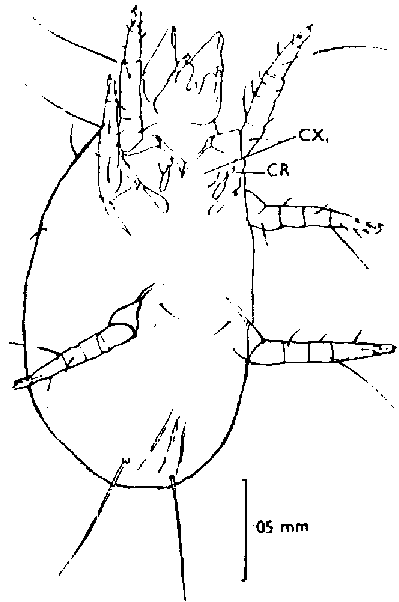 DESCRIPCION. El idiosoma es oval y levemente aplanado, se colorea por el contenido del canal alimentario que se detecta a través de la cutícula. El largo en el macho es de 380 a 400 micrones y en la hembra de 380 a 420. Las patas y el gnatosama son ligeramente rosados. El margen posterior de la región de la espalda, está levemente truncado. Carece de placa propodosomal. La hembra se parece al macho. (Figura 97).