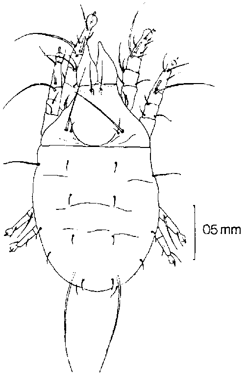 DESCRIPCION: El largo del idiosoma del macho homomórfico mide entre 600 a 900 micrones, el del macho heteromórfico de 700 a 1.000 y el de la hembra de 800 a 1.000 micrones. La cutícula es lisa, incolora y brillante. Los apéndices son de color café pálido. La placa dorsal del propodosoma es ligeramente cóncava en el margen posterior. El gnatosoma es delgado y ahusado. Las patas son delgadas terminando en una uña con un pretarso bien desarrollado. (Figura 94).