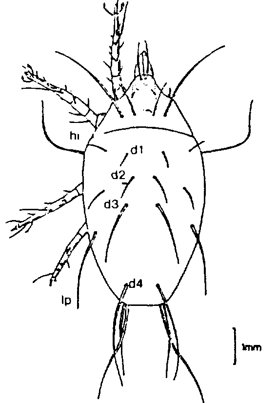 La placa dorsal del propodosoma es casi de forma triangular y parcialmente cubre la parte del gnatosoma.