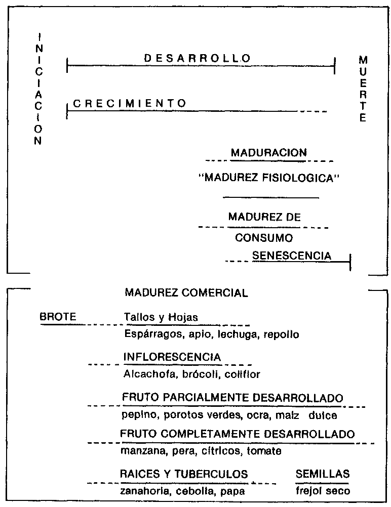La madurez comercial es simplemente las condiciones de un órgano de la planta requerido por un mercado. Comúnmente guarda escasa relacion con la madurez fisiológica y puede ocurrir en cualquier fase del desarrollo o envejecimiento. Los términos Inmadurez, madurez óptima y sobremadurez se relacionan con las necesidades del mercado. Sin embargo, debe haber comprensión de cada uno de ellos en términos fisiológicos, particularmente en lo que conclerne a la vida de almacenamiento y calidad cuando maduran. i a figura 16, ilustra las diferencias entre madurez fisiologica y comercial. Para determinar la madurez óptima de recolección de frutas y hortalizas se usa una combinzción de criterios subjetivos y objetivos. En el método subjetivo usamos nuestros sentidos para evaluar la madurez de frutas y hortalizas mediante: