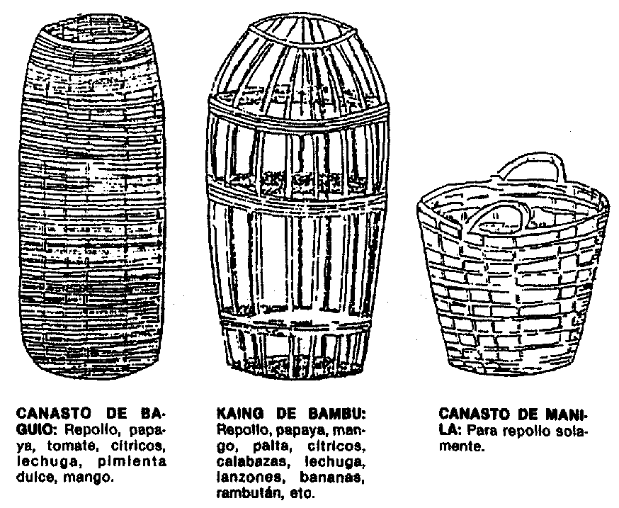 En Tailandia, los recipientes que predominan son los canastos de bambú tejido de 25 y 50 kg. para frutas y hortalizas, respectivamente. Estos recipientes se usan ampliamente como artículos retornables, tres o varias veces, y el costo del recipiente es una parte aceptada de los acuerdos comerciales en el proceso de mercadeo. Si un productor abastece a un comerciante con 20 canastos de productos, él espera el pago de su mercancia y la devolución de 20 canastos vacios; o si estos no son devueltos, el espera que se le de el equivalente en dinero de 20 canastos nuevos.