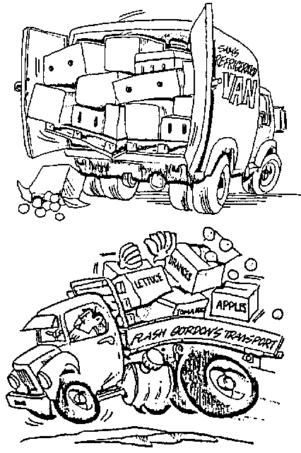 Figura 29. Problemas comunes en el transporte do productos frescos (Dibujos reproducidos de Debney, H.G., et al.,1980)