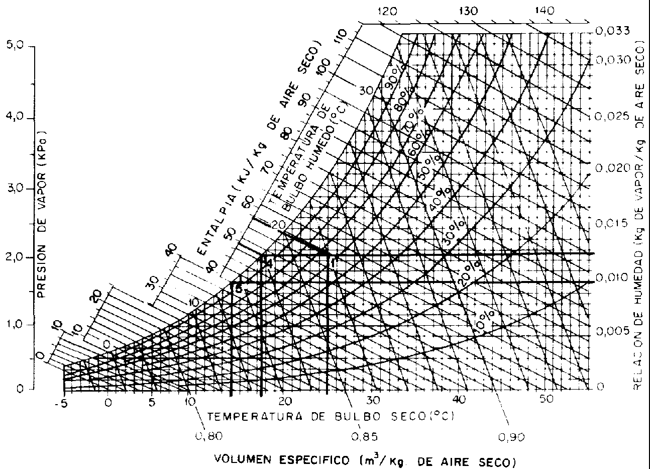 La Figura 7 muestra el enfriamiento de una masa de aire con sus propiedades termodinámicas definidas en el punto de estado 1 (T = 25 °C y Tbh = 20 °C) hasta el punto de estado 4. Se observa que el punto de estado se desplaza horizontalmente hacia la izquierda hasta llegar a la línea de saturación, lo que indica que se alcanzó el punto de rocio (punto 4). Si el enfriamiento continúa hasta la temperatura de 14 C (punto 5), habrá condensación de 0,0027 kg de vapor/kg de aire seco, y la entalpía del aire disminuirá en 18,5 kJ/kg de aire seco. En el Cuadro 5 constan los valores de las propiedades termodinámicas del aire en el proceso descrito.