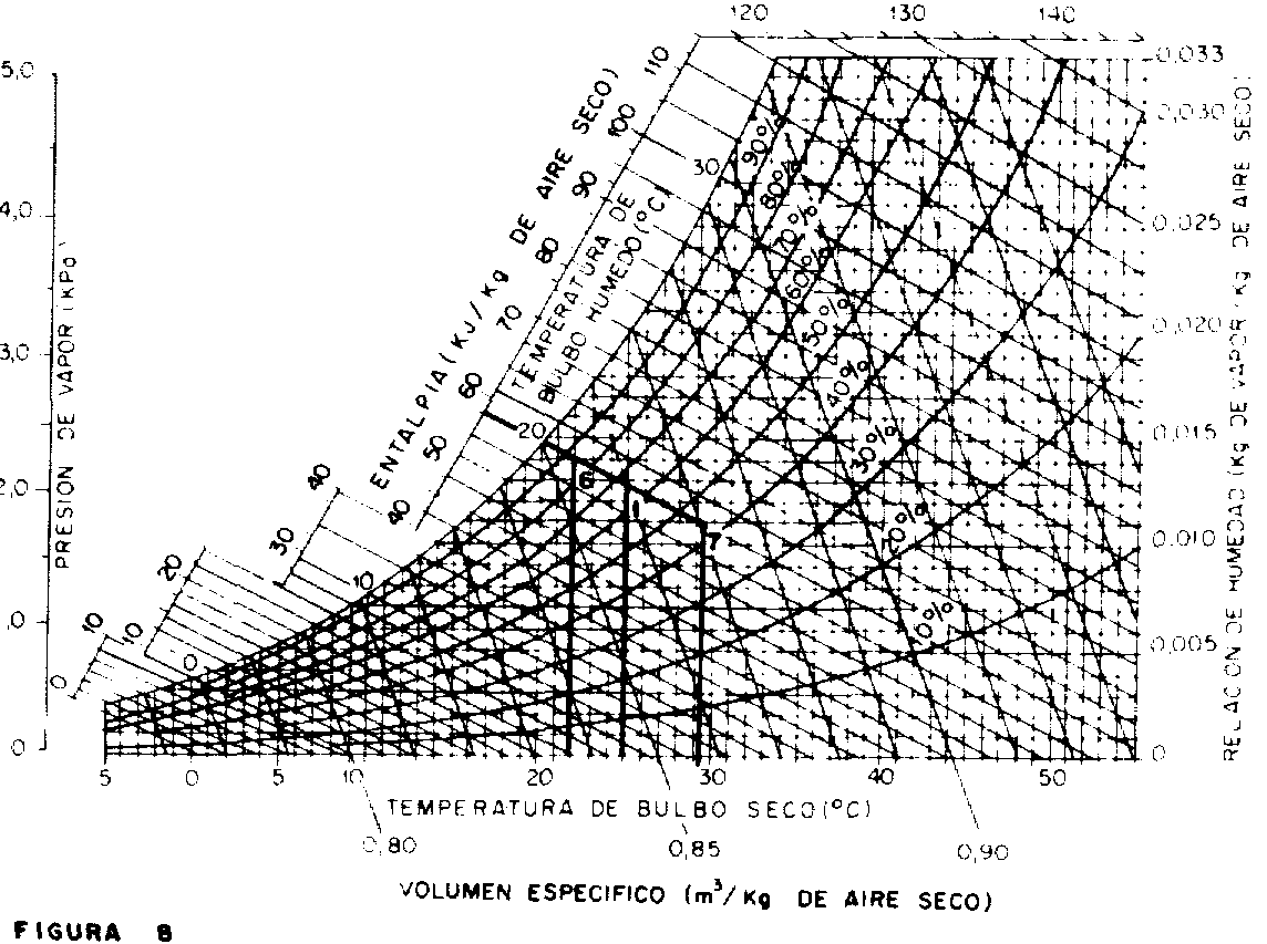 El cuadro 8 se emplea en la determinación de la humedad relativa del aire, cuando se conocen las temperaturas de bulbo seco T, y de bulbo húmedo Tbh. Dicha tabla se preparó para presión atmosférica normal (nivel del mar). El Cuadro 8 es de doble entrada: la temperatura del termómetro de bulbo seco T, se encuentra en la primera columna y la depresión psicrométrica (T - Tbh) en la primera línea Los diversos valores de humedad relativa constituyen el cuerpo de la tabla. Así, por ejemplo, para una temperatura de bulbo seco (T) de 28 °C y temperatura de bulbo húmedo (Tbh) de 25 °C se encuentra en la primera columna el valor correspondiente a T = 28 °C (véase el Cuadro 8). Siguiendo horizontalmente hasta la columna cuya depresión Micrométrica es 3 °C se encuentra el valor de f = 78% de humedad relativa del aire.