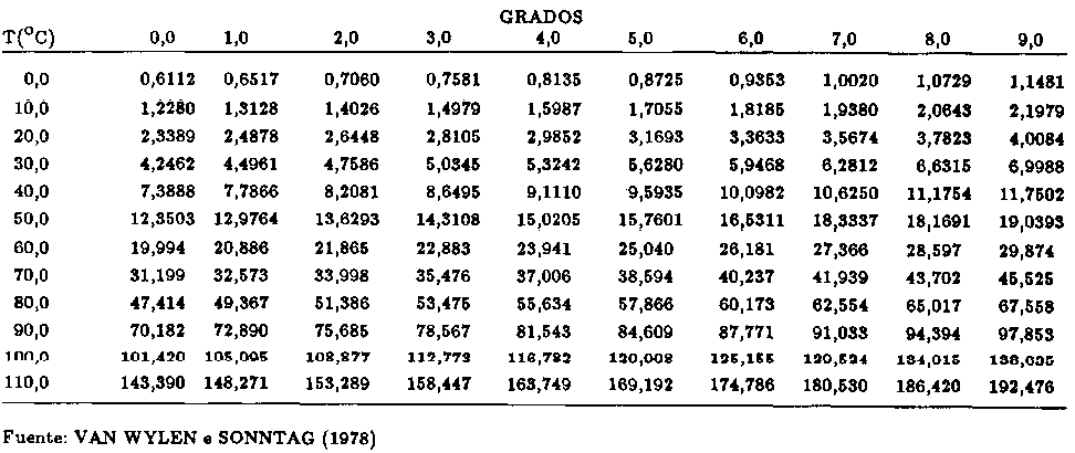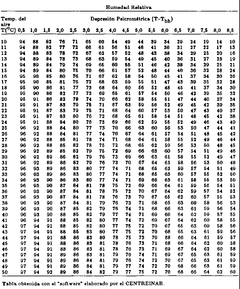 La medida de la humedad relativa del aire se puede obtener mediante las temperaturas de bulbo seco y de bulbo húmedo, medidas con un psicrómetro. La disminución de la temperatura de bulbo húmedo depende de la cantidad de vapor de agua que contiene el aire, además de la velocidad del aire en torno a la tela embebida en agua destilada. El déficit de saturación se encuentra por la diferencia entre la presión de vapor de agua saturado (PVS) y la presión de vapor real del aire (Pv ), a la temperatura en que se encuentra el aire. Cuando se conoce la temperatura del aire, la presión del vapor de agua saturado (PVS), se puede obtener en el Cuadro 7, en unidades del Sistema Internacional de Unidades (Si).