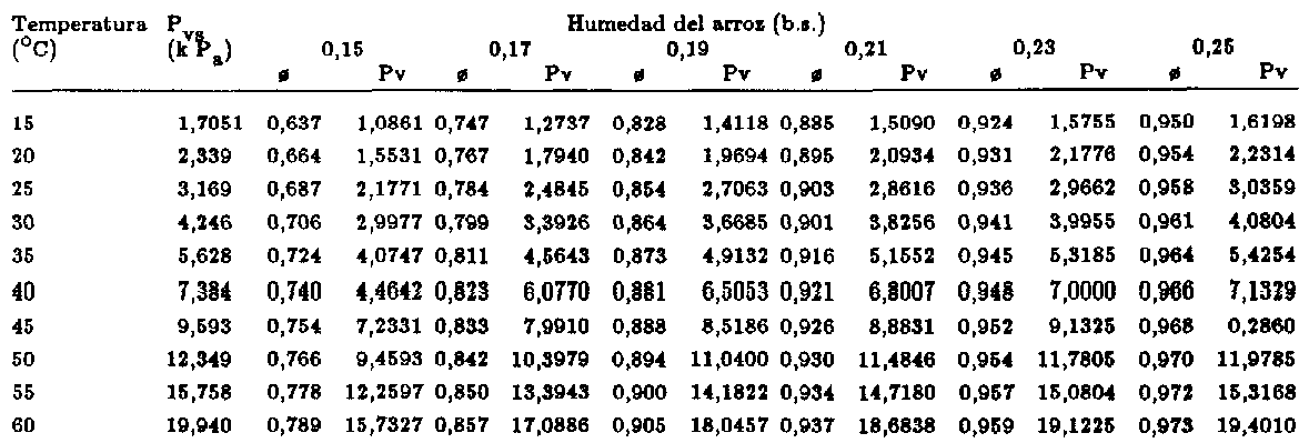 De este modo, si se desea determinar la entupía de vaporización de humedad del agua del arroz en cáscara, a temperaturas en la gama de 15 a 60 °C. y con contenidos de humedad en la gama de 0,15 a 0,25, base seca, se puede utilizar la ecuación de Chung-Pfost, ecuación 30, cuyos parámetros constan en el Cuadro 11: