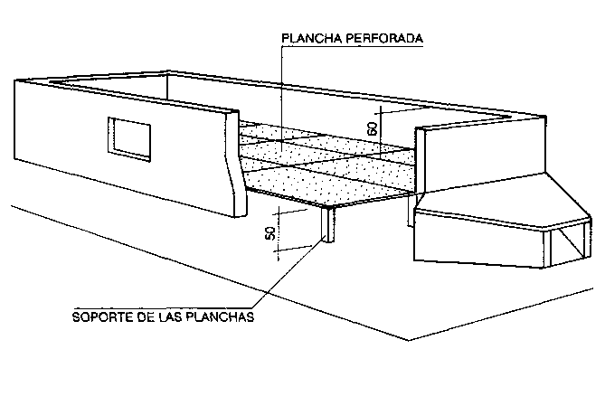a) Cámara de secado y cámara de distribución de aire (Figura 5). La cámara de secado debe tener el piso de plancha metálica perforada, de modo que el área perforada sea por lo menos el 10% del área total, para evitar que haya altos valores de pérdida de carga. La cámara de secado puede ser rectangular o circular. El piso de forma rectangular debe tener una relación de 1,5 entre el lado mayor y el lado menor próximo. El piso de forma circular exige mayor cantidad de planchas para su construcción. Si la velocidad del aire que entra en la cámara de distribución es inferior a 1 m/s, la forma del piso deja de tener importancia para el buen desempeño. Para facilitar la mantención del piso de la cámara de secado y del ''plenum", y evitar elevadas pérdidas de carga, se puede utilizar una cámara de distribución de aire con una altura de 0,5 m. Los agujeros de las planchas de metal perforadas deben ser tales que no permitan el paso del producto, teniendo en cuenta que interesa más una cantidad elevada de orificios pequeños que pocos orificios de mayor diámetro. La estructura para soportar las planchas de metal perforadas y la masa del producto pueden ser de distintos materiales, como albañilería y madera, fierros de construcción y perfiles metálicos. La cámara de secado deberá contar con aberturas laterales para la descarga manual o mecánica del producto y un sistema de boquilla para facilitar el ensacado, en caso necesario. La altura total del secador es de 1,2 m. aproximadamente, de los cuales 0,70 m. corresponden a la altura de la cámara de secado y 0,5 m. a la altura del "plenum". Para facilitar la limpieza de la cámara de distribución de aire del secador, se puede construir el piso de la cámara de secado de modo que una de las planchas perforadas se pueda retirar.