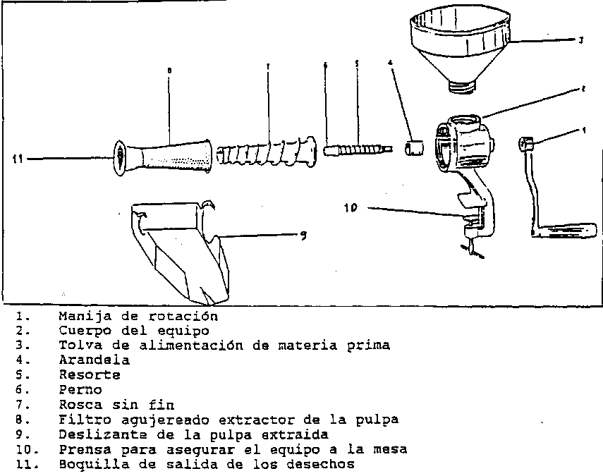 Despulpadora esta consiste en un molina el cual tiene una tolva superior, por donde es alimentado con la materia prima, la que pasa a través de un filtro agujereado extractor de la pulpa en forma de cono cuyo interior esta compuesto por un tornillo sin fin el que es accionado por una manilla en sentido horario. Esta despulpadora puede servir para diferentes tipos de frutas sólo se debe cambiar el filtro del cono, dependiendo de que tan pequeña sea la semilla. Otra característica de la despulpadora es su fácil instalación, ya que sólo se necesita una mesa o superficie lisa, fijándose a ella mediante una prensa. También cabe mensionar que esta despulpadora puede ser accionada mediante un motor, el que se conectara cuando se requiera, para así agilizar el proceso.