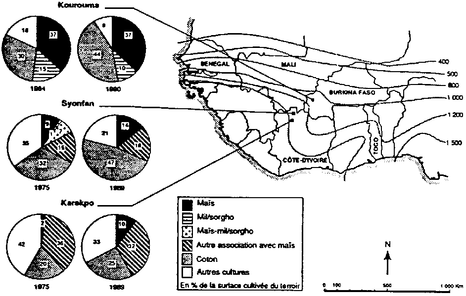 Les terroirs concernés - sud du Mali, centre-ouest du Burkina Faso, centre du Togo - appartiennent à l'aire de culture traditionnelle du sorgho (pluviométrie comprise entre 800 et 1 200 mm). Le maïs était initialement connu mais sa culture n'occupait qu'une place marginale. Elle était généralement cantonnée aux «champs de case»(voisinage immédiat des exploitations, bénéficiant d'un entretien particulier et cultivé de façon continue). La diffusion du maïs correspond à un déplacement de la culture au sein des terroirs: l'introduction en «plein champ», domaine du mil-sorgho.