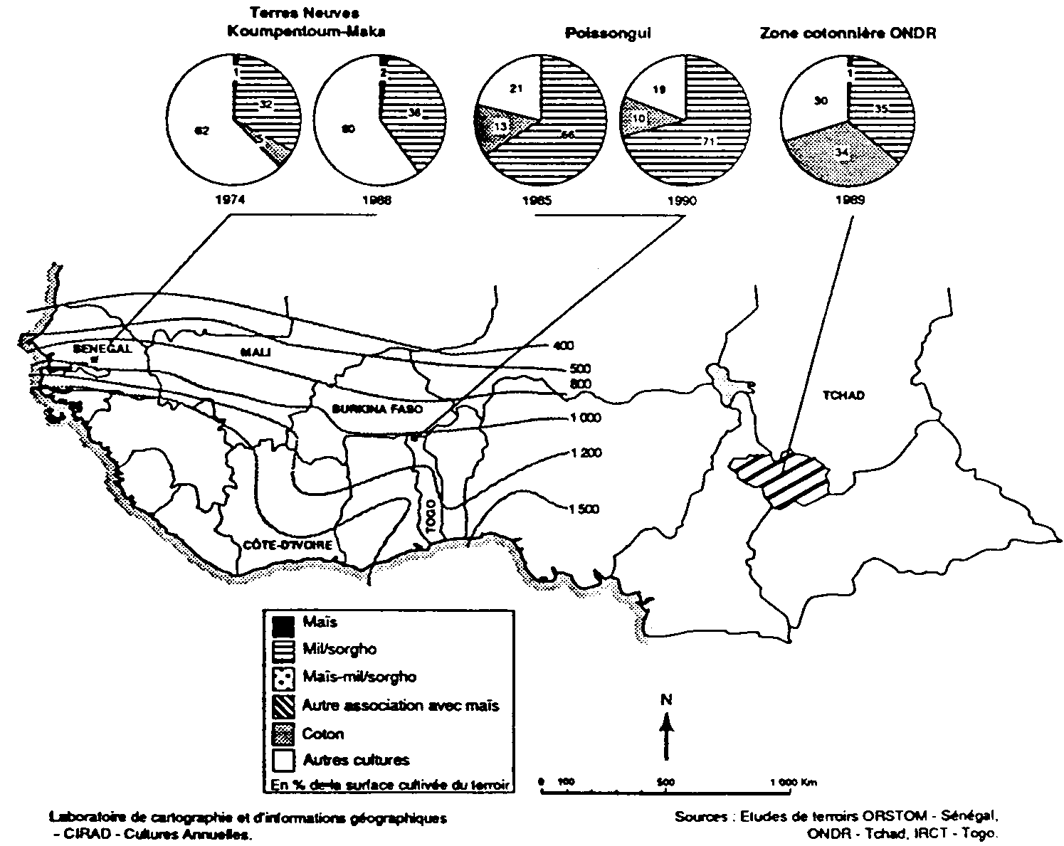 Les trois terroirs concernés - «Terres neuves» du Sénégal oriental, nord du Togo, sud du Tchad recouvrent des situations contrastées. Au Sénégal oriental, il s'agit d'une zone d'immigration où les disponibilités foncières restent abondantes. En 1974, lors de l'installation des agriculteurs migrants, sous l'égide d'un projet, le cotonnier et le maïs avaient été proposés par l'encadrement. Le rejet du «paquet technique coton-maïs» semble tenir, en première analyse, à l'existence d'une alternative plus rémunératrice: la culture de l'arachide.