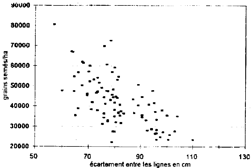 Figure 2. Relation entre nombre de grains semés à l'hectare et écartement