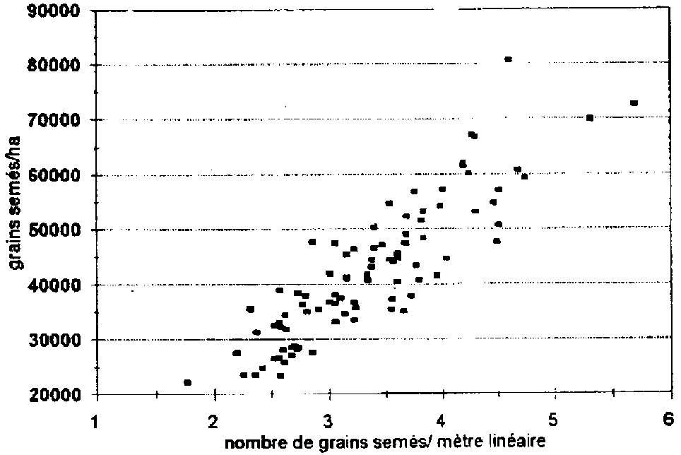Figure 3 Relation entre nombre de grains semés à l'hectare et densité de semis sur la ligne.