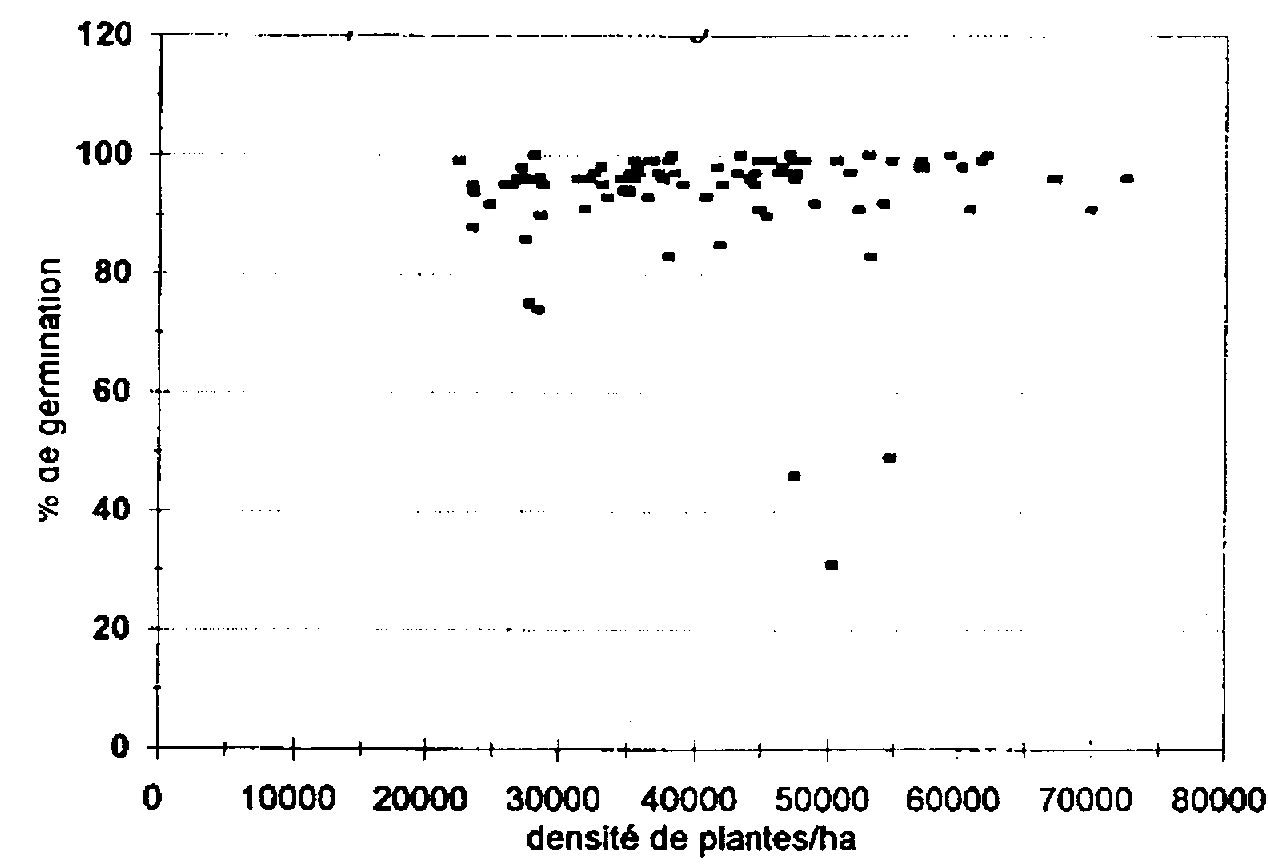 Des études, qui portaient plus précisément sur la compréhension de l'installation de la population, font ressortir que seulement 17 % des exploitants se situent dans les normes recommandées (50 000 à 62 500 plantes/ha), tandis que 30 % ont une densité inférieure à 30 000 plants/ha, c'est à dire une situation où la densité devient fortement limitante.