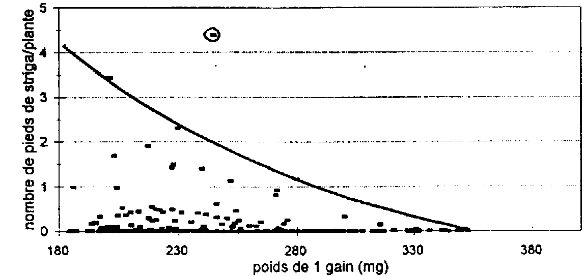 Les résultats permettent de noter une relation négative nette entre le taux d'infestation (exprimé en pieds atteints par segment de ligne de maïs) et le rendement en grains (figure 7, courbe enveloppe supérieure).