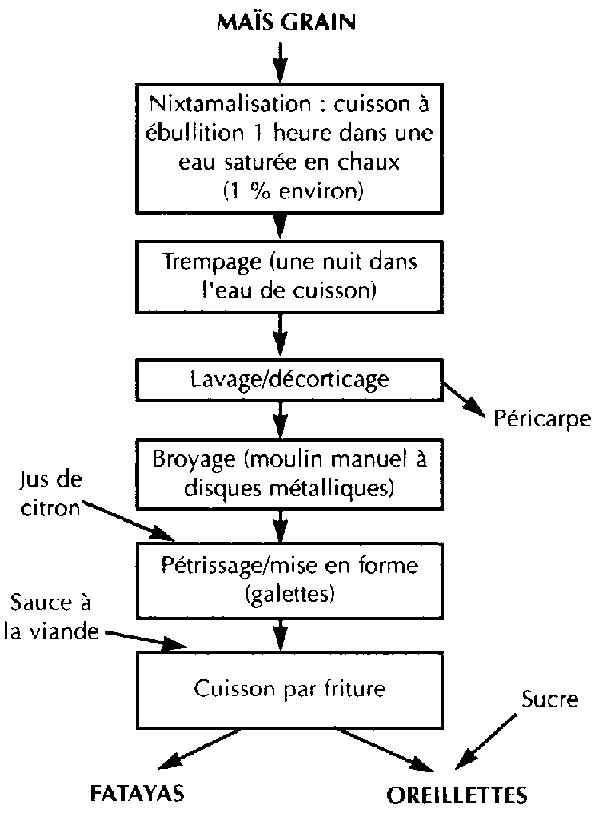 Au Mexique, ainsi que dans la plupart des pays d'Amérique centrale, la consommation de maïs est presque toujours associée à la nixtamalisation, procédé de cuisson alcaline du grain de maïs entier (cf. supra), qui est ensuite broyé pour donner la masa, source d'une multitude de produits secondaires. En mode manuel, le broyage du nixtamal est une opération longue et pénible: il demande quotidiennement près de trois heures aux femmes (FERRE, 1992). C'est pourquoi une filière artisanale de production de la masa s'est développée. Par exemple, au Mexique, NOVELLO et GARCIA (1987) ont dénombré 12 000 moulins à nixtamal qui préparent et vendent de la masa aux particuliers. Cette filière produisait alors près de 40 % de la masa. Il existe aussi une filière industrielle qui produit une farine nixtamalisée sèche. Toutefois, ce produit n'est pas adapté aux matériels de seconde transformation (problème de texture) et aux demandes des consommateurs (couleur); la filière industrielle (16 unités de production de farine) ne fournit que 10 % des produits nixtamalisés mexicains (JAVIER HARO DE ALBA, 1985).