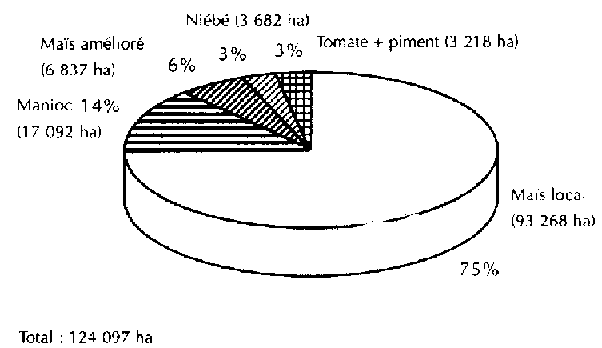 La production végétale est dominée par les cultures vivrières, surtout le maïs et le manioc. D'après les résultats d'enquêtes du projet «Sécurité alimentaire» en 1992, tout le département connaît un déficit global en légumineuses estimé à 1 000 tonnes par an, un déficit de 50 000 tonnes de maïs dans la moitié sud et un excédent de 10 500 tonnes dans la moitié nord. Le maïs est une culture qui, selon les statistiques des années 1984 à 1992, a occupé en moyenne plus de 80 % des superficies des vivriers (figure 2). C'est une denrée stratégique dans la plupart des exploitations agricoles du département.