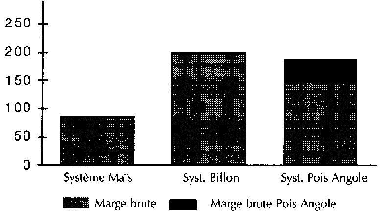 Une étude des performances des techniques d'allongement de la durée sous culture des sols, «manioc dense» et billons, réalisée par le programme étude des systèmes de culture traditionnels (ESYCTRA) a montré qu'en termes de marge brute, ces techniques endogènes sont globalement supérieures au pois d'Angole (figures 3 et 4). Cela explique l'attachement des paysans à ces pratiques au détriment des alternatives proposées par la vulgarisation agricole (HINVI et al. 1990). En effet, outre le pois d'Angole dont les raisons de la non-adoption sont expliquées ci-dessus, la plupart des paysans ne pratiquent pas les rotations culturales conseillées et l'utilisation des engrais chimiques. En ce qui concerne les engrais chimiques, dont les prix sont d'ailleurs relativement élevés, leur rentabilisation sur les sols très pauvres n'est pas évidente à cause de la pauvreté marquée de ces sols en matière organique. D'autre part, la spécialisation des exploitations en maïs pour «assurer»l'autosuffisance pour cette denrée ne permet pas de pratiquer une bonne rotation culturale pour stabiliser le rendement du maïs. Il n'y a donc pas de «compromis» équilibré entre la satisfaction des besoins pressants d'aujourd'hui et la nécessité d'adopter des pratiques culturales qui assurent de manière durable de bons rendements en maïs. Il y a là un défi pour la recherche agronomique.