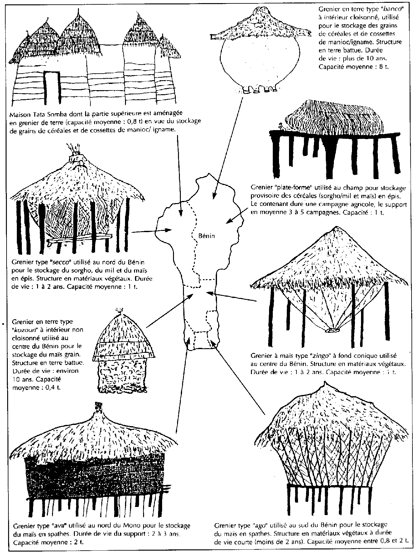 Le «système» de stockage, en dehors des structures de stockage qui en constituent l'élément central, est un ensemble d'opérations unitaires telles que la récolte proprement dite, la préparation du produit avant le stockage et la protection phytosanitaire des produits en cours de stockage. Dans cet ensemble, c'est l'«élément» structure de stockage qui varie fondamentalement d'une région à une autre, en raison des exigences agroclimatiques du milieu. Des facteurs ethnologiques (appartenances ethniques) et socio-économiques jouent également un rôle important dans cette variation (figure 1). Au Bénin, il y a une très forte prédominance du stockage familial et la conception des structures utilisées, tant en ce qui concerne l'architecture que les matériaux utilisés, reflète cette prédominance.