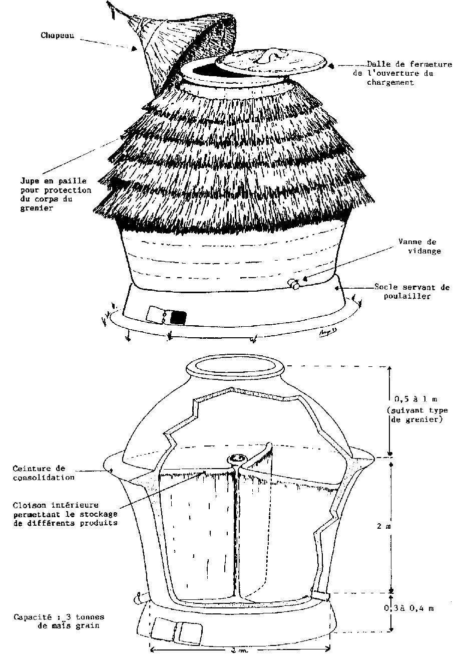 Ce projet, qui a pour objectif principal la promotion du stockage des produits vivriers sous le contrôle et la gestion des producteurs et petits commerçants, a permis de concevoir et de choisir des structures (figures 4 et 5) et des techniques améliorées de stockage-conservation dans 3 zones pilotes. La démarche adoptée a été de partir de l'existant pour l'améliorer et ce, en tenant compte d'une part des faiblesses décelées dans les structures et les techniques existantes, et d'autre part, des souhaits d'amélioration exprimés par les paysans.
