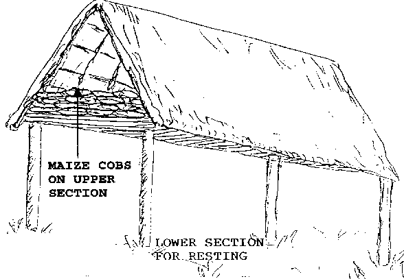 The maize cobs are picked by hand from the plant and the outer sheaves of each cob are stripped off and discarded, leaving the tightly clasping inner sheaves intact around the cob. The partially dehusked cobs are then carried home in baskets and placed within a structure called a "banda", or kitchen ceiling (figure 1). Normally the cobs are spread out evenly over this ceiling to form a layer of not more than 30 to 40 cm, for adequate drying. Drying is then carried out with supplemented firewood heat provided by a strong fire, which is kept continuously burning in the kitchen for at least two weeks after harvest. It is believed that the smoke of the family's cooking fire has a repelling effect against insects.