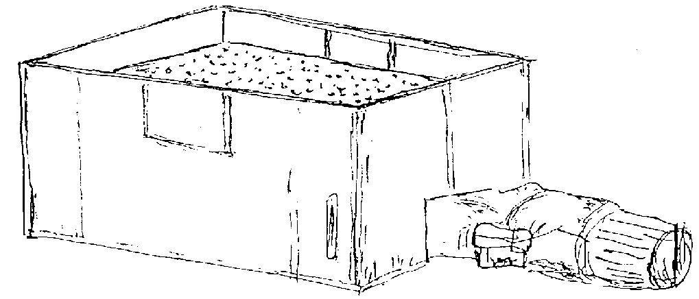 Figure 6. The Brook-type dryer, a funnel made of metal drums conducting firewood heat for drying.