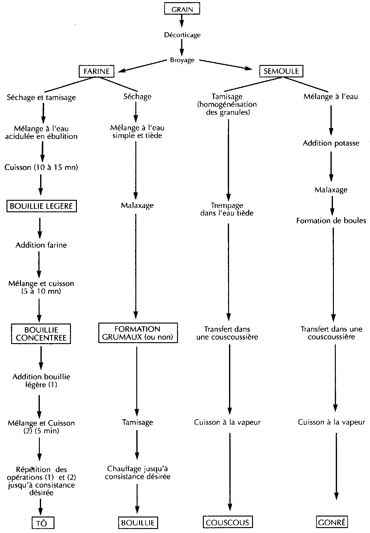 La transformation proprement dite du grain sec pour la préparation des aliments culinaires. Deux processus sont utilisés: