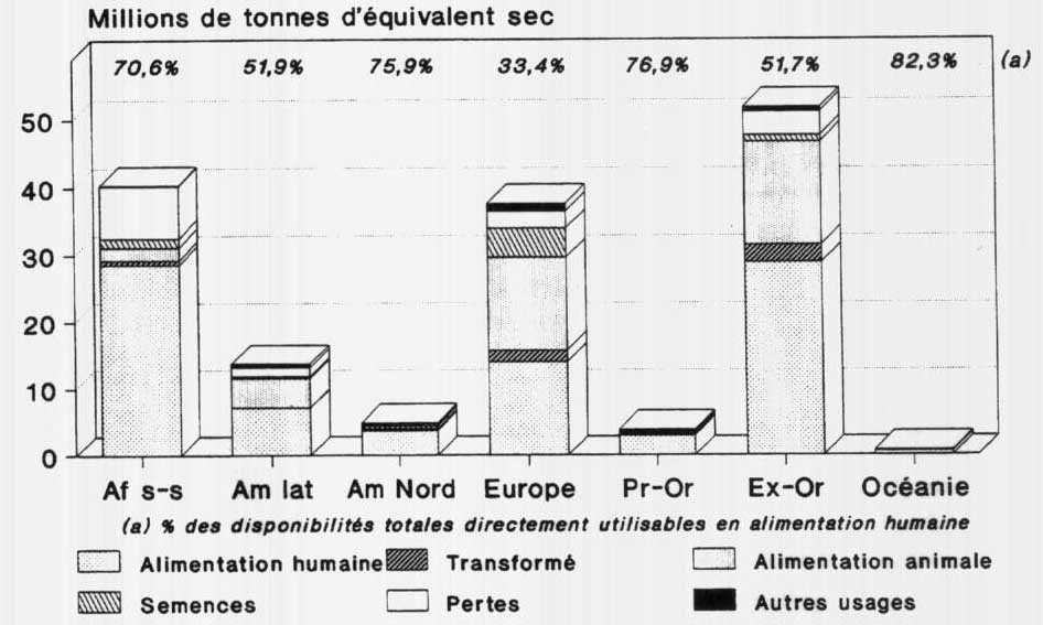 Les régions bénéficiant des plus fortes disponibilités totales en RTB sont l'Extrême-Orient (51,7 Mt éq sec), l'Afrique sub-saharienne (40,3 Mt éq sec) et l'Europe (37,6 Mt éq sec), mais les RTB directement disponibles pour l'alimentation humaine se retrouvent environ pour un tiers en Afrique sub-saharienne, un tiers en Extrême-Orient et un tiers dans l'ensemble des autres régions du monde.