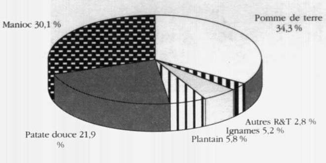 Parmi les 10 pays bénéficiant des plus importantes disponibilités énergétiques alimentaires à partir de chacune des espèces, on relève une majorité de pays européens pour la pomme de terre, de pays africains pour le manioc, le plantain et les ignames et de pays asiatiques pour la patate douce. On peut souligner que 1/3 du manioc directement disponible pour la consommation humaine se situe au Zaïre et au Nigeria, que plus des 3/4 de la patate douce est localisé en Chine, que 1/5 du plantain se trouve en Ouganda et que près de 60% des ignames est consommé au Nigeria.