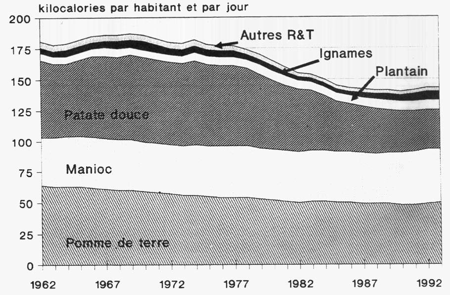 L'évolution de la contribution des RTB aux DEA totales dans le monde au cours des trois dernières décennies montre que si une baisse sensible a pu être observée depuis le milieu des années 70, celle-ci affecte principalement la patate douce en Asie et la pomme de terre en Europe, c'est-à-dire des zones où ces productions ne constituent actuellement pas les principaux aliments de base. En revanche, en Afrique sub-saharienne, les différentes espèces de RTB continuent à contribuer au même niveau que par le pays aux DEA totales des populations et constituent souvent la principale source énergétique alimentaire sans aucune autre alternative à court et moyen termes. Dans ces parts, une diversification des sources énergétiques alimentaires est souhaitable et doit être encouragée, en particulier lorsqu'une seule espèce de RTB constitue plus du tiers des DEA totales, mais la maîtrise de la sécurité alimentaire passe prioritairement par une adaptation des circuits de production, de transformation et de commercialisation des RTB aux évolutions des modes de vie et des préférences alimentaires.
