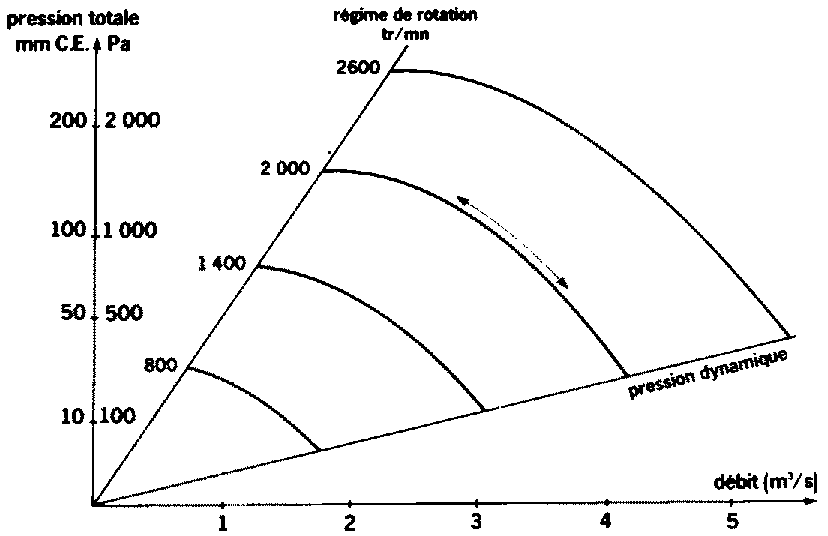 On a vu qu'un ventilateur fournit un débit sous une certaine pression. Pour un régime de rotation fixé à l'avance, ces 2 grandeurs physiques sont liées entre elles par une courbe "débit-pression" sur laquelle il est possible de situer le point de fonctionnement Le ventilateur fonctionnant toujours au même régime (quelle que soit la charge) le point correspondant se trouve toujours sur la même courbe.