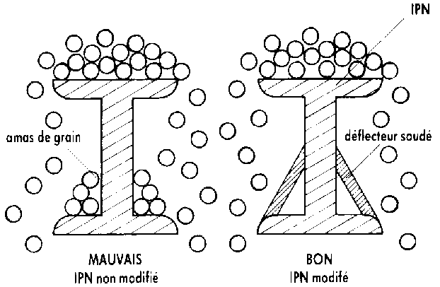 Si les véhicules ne passent pas sur la fosse, une simple armature en cornière de 50 mm ou en IPN de 60 mm, sur laquelle repose du métal déployé, suffit. Dans tous les cas, la couverture doit être conçue de façon à permettre le libre écoulement du grain au cours du déchargement. Il faut, dans le cas d'une armature en IPN, souder des déflecteurs sur les ailes, pour supprimer tous les plans horizontaux; dans le cas de cornières métalliques, positionner ces dernières avec l'arête vers le haut.