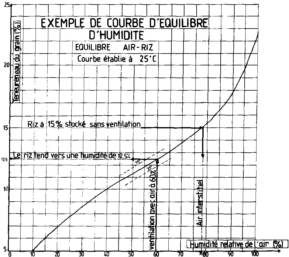 A 25° C, le riz à 15 % d'humidité est en équilibre avec de l'air à 78 % d'humidité relative. Si la masse de riz est ventilée avec de l'air à 25° C et à 60 % d'humidité relative, elle tendra vers une humidité de 12,5 %.