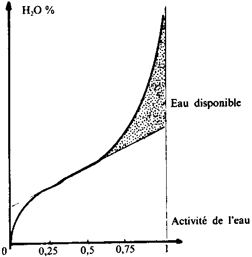 Les recherches ont montré que la fraction d'eau comprise entre la courbe d'équilibre et la partie linéaire extrapolée est une eau suffisamment libre pour constituer un milieu de diffusion favorable aux réactions chimiques et enzymatiques, ainsi qu'au développement des micro-organismes (Fig. 6).