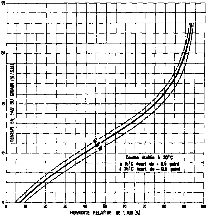 Nous avons vu que les grains constituent un matériau hygroscopique, c'est-à-dire qu'ils ont la faculté d'échanger de l'eau (sous forme vapeur) avec le milieu ambiant. A une température donnée, cet échange est caractérisé par un équilibre entre l'eau contenue dans le grain et l'eau (vapeur) présente dans l'air qui l'environne: c'est l'équilibre Air-Grain. Ce point faisant appel à la notion d'humidité relative de l'air, il nous semble utile d'en rappeler la définition.