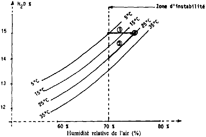 Soit du maïs à 15 % d'humidité et à 25° C; son point figuratif est dans la zone d'instabilité. Dans les pays disposant de température froide (températures fraîches en automne en France), il est possible de refroidir progressivement le grain par ventilation pour l'amener dans une zone proche de la stabilité: c'est le chemin n° 1. Par contre, dans les régions chaudes, le grain conserve toujours une température importante. Il n'est donc possible d'atteindre la zone de stabilité qu'en abaissant son humidité: c'est le chemin n° 2.