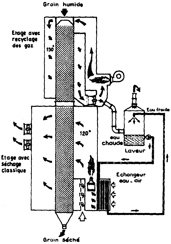 Nous pouvons reprendre le schéma de principe pour un séchoir biétagé. L'air très chaud (150° C) qui attaque les grains (très humides) de l'étage supérieur est recyclé. Cet air bien saturé et chaud est condensé au niveau d'un laveur, l'eau récupérée est chaude. Au niveau d'un échangeur eau-air (10 fois plus performant qu'un échangeur airair), elle cède sa chaleur à l'air frais entrant dans la partie inférieure du séchoir en le préchauffant à 40° C - 45° C.