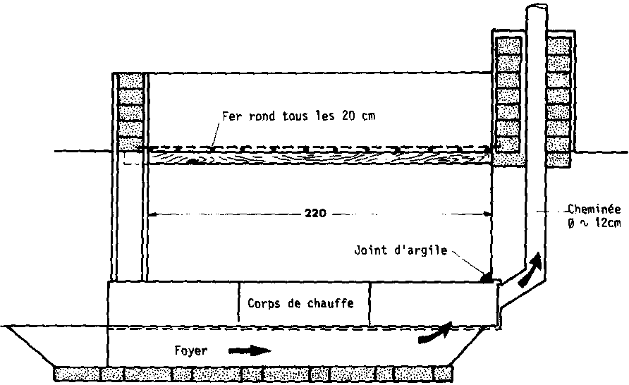 Le corps de chauffe, constitué par des demi-fûts métalliques disposés en tunnel, réchauffe l'air de séchage qui pénètre sous le fauxfond par 2 évents situés de part et d'autre du foyer et traverse la couche de grains ou d'épis à sécher par convection naturelle de l'air chaud.
