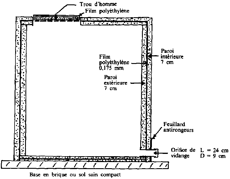 | * Orifices | : il est prévu un trou de visite de 60 x 60 cm dans le toit. La feuille de polyéthylène n'est pas découpée à cet endroit, mais seulement fendue selon la diagonale de l'ouverture. Un orifice de vidange est prévue à la base de la cellule. |