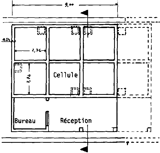 La structure utilisée (Fig. 97) se compose de plusieurs cellules de stockage en vrac d'environ 20 m³ chacune (2,70 x 2,70 x 2,70), d'un bureau et d'une aire de réception et parfois d'une zone pour le stockage en sacs. La construction, en maçonnerie, est protégée des remontées d'humidité par une barrière antivapeur (bitume). Les murs extérieurs de 30 cm d'épaisseur sont en briques cuites ou en parpaings, les séparations intérieures ont 20 cm d'épaisseur. Les murs sont enduits sur les deux faces par un crépissage additionné de produit hydrofuge. Des chaînages permettent le maintien de la structure.