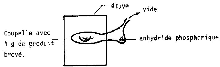 Un échantillon de 5 g de produit broyé est placé dans une étuve a 130° C. Après un étuvage de 2 ou 4 h (maïs) l'échantillon est placé dans un récipient contenant un produit dessiocateur (gel de silice) et laissé à refroidir pendant 45 nui. Il est alors pesé à nouveau.