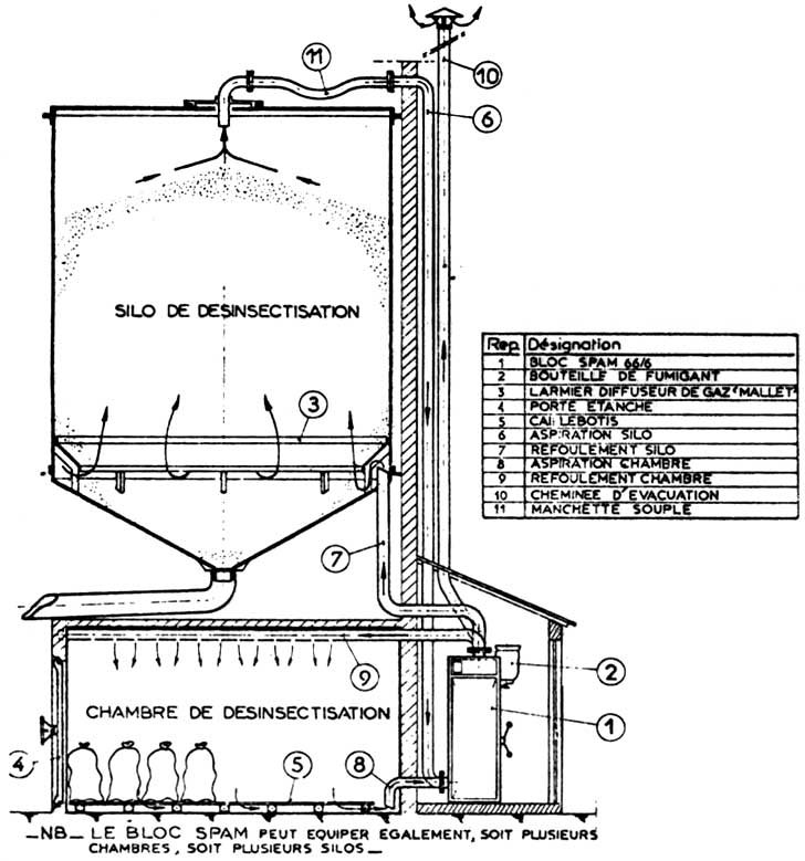 Dans les installations de stockage en vrac, il est conseillé de prévoir une cellule et hôpital» étanche équipée pour le traitement des grains. Dans la plupart des cas une cellule pouvant contenir 1/30 du stock total de l'installation est suffisante. Pour être étanches, les cellules doivent être en tôle soudée ou béton vibré. L'air est recyclé par un turboventilateur qui l'aspire au sommet de la cellule et le refoule, additionné de fumigant, à la base. Le renouvellement de l'air doit être de 10 fois le volume de la cellule par heure. En 1 h le fumigant est convenablement réparti dans la masse de grains. La durée du traitement est de 24 h. En pratique, peu de silos sont équipés de ce type de cellule, c'est pourquoi, le plus souvent, pour le traitement en silo, l'emploi de comprimés de PH3 est plus aisé.