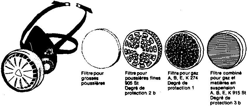 Certaines cartouches contiennent en plus un filtre pour les matières en suspension. Rappelons que les masques antipoussières sont totalement inefficaces pour protéger contre les fumigants.