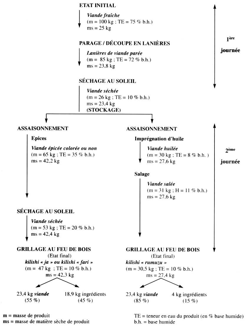 Pour étudier la qualité du kilishi, des échantillons ont été prélevés à chaque étape du procédé, emballés dans des sacs en polyéthylène et transportés dans une glacière au laboratoire. Ils ont alors subi diverses analyses de qualité (composition, analyses physico-chimiques et microbiologiques). La prise d'essai avant analyse consiste en un broyat de morceaux représentatifs de l'ensemble du produit. Les produits finis destinés au stockage sont gardés, selon la procédure traditionnelle, c'est-à-dire empilés sans emballage dans une bassine, chez les transformateurs à température ambiante (30 à 35°C). La teneur en eau et le pH sont mesurés à chaque étape des procédés et sur les produits finis avant et en cours de stockage (4 à 6 semaines). Les teneurs en cendres, en lipides et en protéines sont, quant à elles, mesurées sur la matière première (viande fraîche initiale), ainsi que sur la viande après parage et sur les produits finis avant stockage. Les analyses microbiologiques (dénombrement de la flore aérobie mésophile totale, des coliformes totaux, des levures-moisissures et des anaérobies sulfitoréducteurs) sont effectuées à chaque étape des procédés et sur les produits en fin de transformation et au cours du stockage. Toutes ces analyses de qualité ont également été réalisées sur les enrobages utilisés pour l'assaisonnement du kilishi.