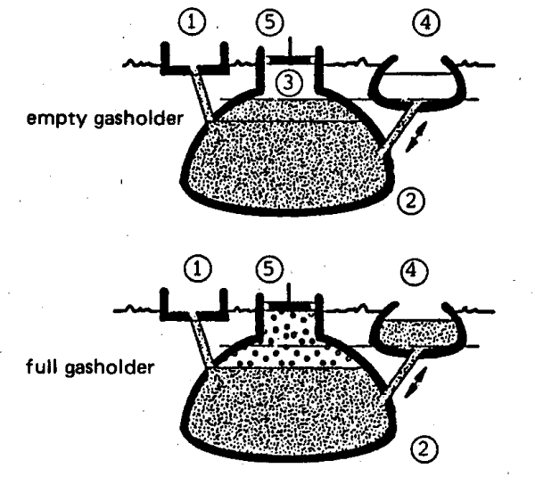 A fixed-dome plant comprises of a closed, dome-shaped digester with an immovable, rigid gas-holder and a displacement pit, also named 'compensation tank'. The gas is stored in the upper part of the digester. When gas production commences, the slurry is displaced into the compensating tank. Gas pressure increases with the volume of gas stored, i.e. with the height difference between the two slurry levels. If there is little gas in the gas-holder, the gas pressure is low.