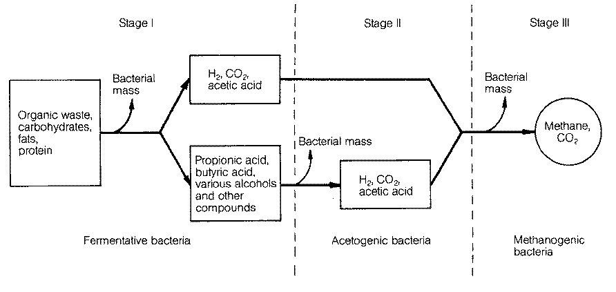 Methane-producing bacteria, involved in the third step, decompose compounds with a low molecular weight. For example, they utilize hydrogen, carbon dioxide and acetic acid to form methane and carbon dioxide. Under natural conditions, methane producing microorganisms occur to the extent that anaerobic conditions are provided, e.g. under water (for exemple in marine sediments), in ruminant stomaches and in marshes. They are obligatory anaerobic and very sensitive to environmental changes. In contrast to the acidogenic and acetogenic bacteria, the methanogenic bacteria belong to the archaebacter genus, i.e. to a group of bacteria with a very heterogeneous morphology and a number of common biochemical and molecular-biological properties that distinguish them from all other bacterial general. The main difference lies in the makeup of the bacteria's cell walls.