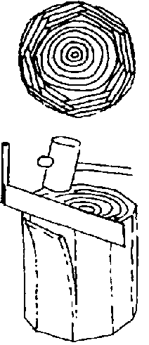 Se cortan cañas de bambú o troncos de madera en la longitud adecuada, del tronco se cortan verticalmente con un cuchillo especial y un martillo, las tejas mientras que las cañas de bambú se cortan al medio o en cuartos.