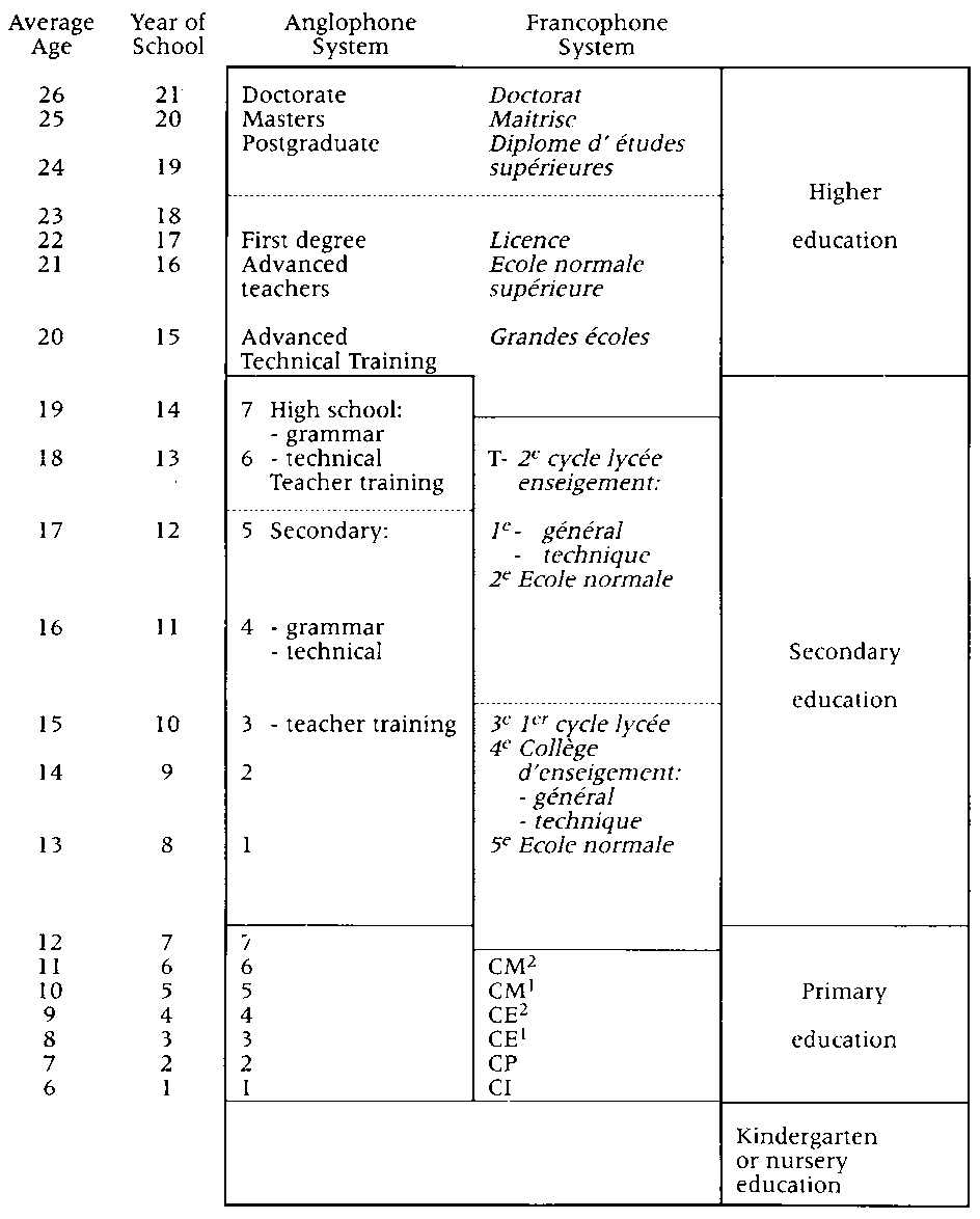 The diagram overleaf (T. N. Postlethwaite, 1988) shows the parallel anglophone and francophone systems of education in Cameroon. The pupils surveyed were in Primary 7 (anglophone) and CM2 (francophone).