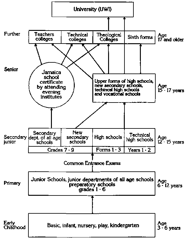 The diagram on upper (T. N. Postlethwaite, 1988, p.399) shows the educational system of Jamaica. The pupils surveyed were in Primary 6 classes, the last year of the primary cycle.