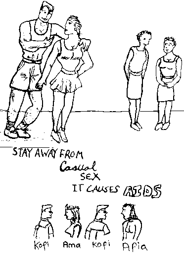 ...a lot of programmes and talks are been held on the TV, radio and especially in our schools and not least from my parents.. (girl 15yrs)An advice is given every day from the television, radio... a man is talking to his child saying my son you may be heading for trouble, have you heard the disease AIDS and the easy way of getting is by chasing sexual partners left and right and the boys said sir but how can a nice looking girls have the AIDS virus and the man said think about it. (boy)