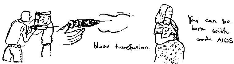 It can be passed on to people when a person has aids and accidentally cut him or herself with a knife and bleeds. When another person without aids also cuts himself on the same knife the person will definitely get aids. Another way is... for example children could be playing if one gets hurt and person is nursing the child has aids and at the same time has a cut on his hand if their blood gets together the child could also catch aids. (Girl)